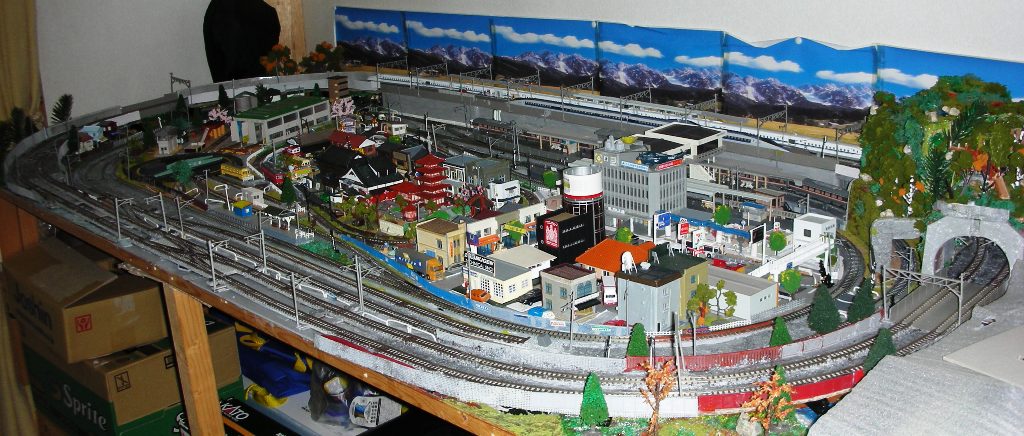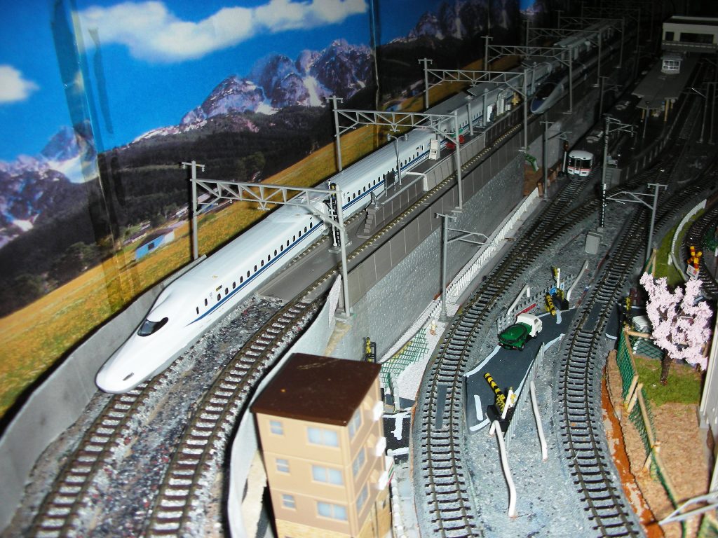 ほぼ完成してきた。暇を見つけては焦りながらコツコツと仕上げてきたが、今回も早く列車を走らせたいと思う気持ちが強くて、雑なところも多々ある。これから少しずつその部分を仕上げて生きたいと思う。今回のレイアウトは、今までに作ったレイアウトを全部解体し、ひとつにまとめたようなもんだ。新幹線、在来線、私鉄、地方田舎鉄道、ターンテーブル蒸気機関車風景と欲張りすぎたのでごちゃごちゃしすぎの感じもある。